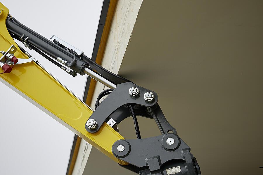 Med 3-punkts-kinematikken ble den tradisjonelle leddforbindelsen for skuffen løftet til et nytt nivå. Med denne «3-boltskonstruksjonen» utvides skuffens dreievinkel til 200 grader – det er 10 % mer enn ved tradisjonell leddforbindelse for skuffen. Dermed økes den loddrette innstikksdybden samt gravekreftene. Det er ikke nødvendig å flytte gravemaskinen så ofte og effektiviteten øker betydelig.