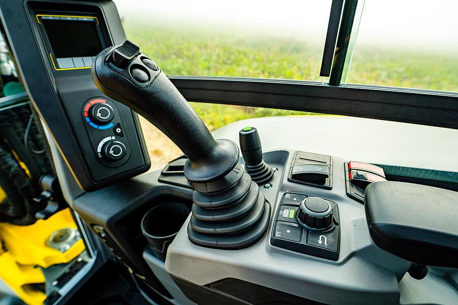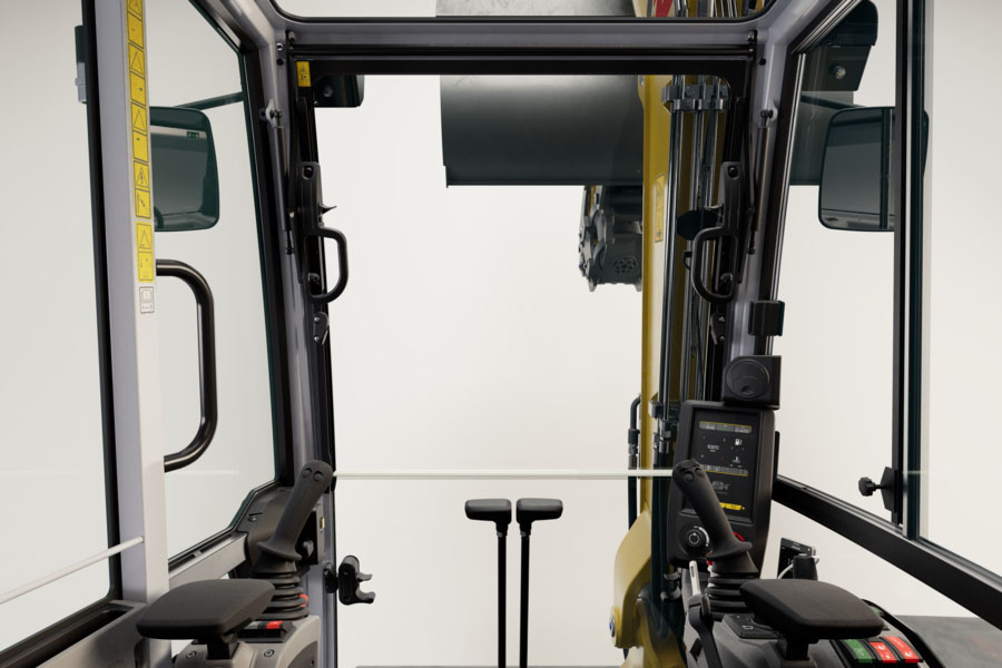 En rød LED-stripe, som går på tvers over motorpanseret, lyser straks styrespakholderen trykkes ned. Dette signaliserer til personer i omgivelsene at gravemaskinen er klar til drift og kan bevege seg når som helst.